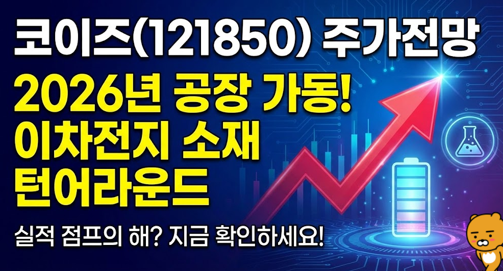 안녕하세요! 오늘은 IT 부품 강자에서 이차전지 소재 유망주로 변모하고 있는 코이즈(121850)의 주가 전망과 2026년 핵심 투자 포인트를 짚어보겠습니다.